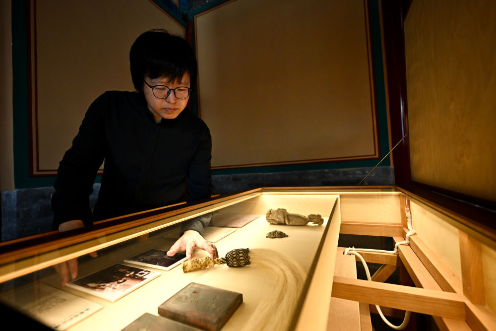 朱起鹏在《宏恩观:一座北京庙宇的故事》展厅内整理展品(7月19日摄)。