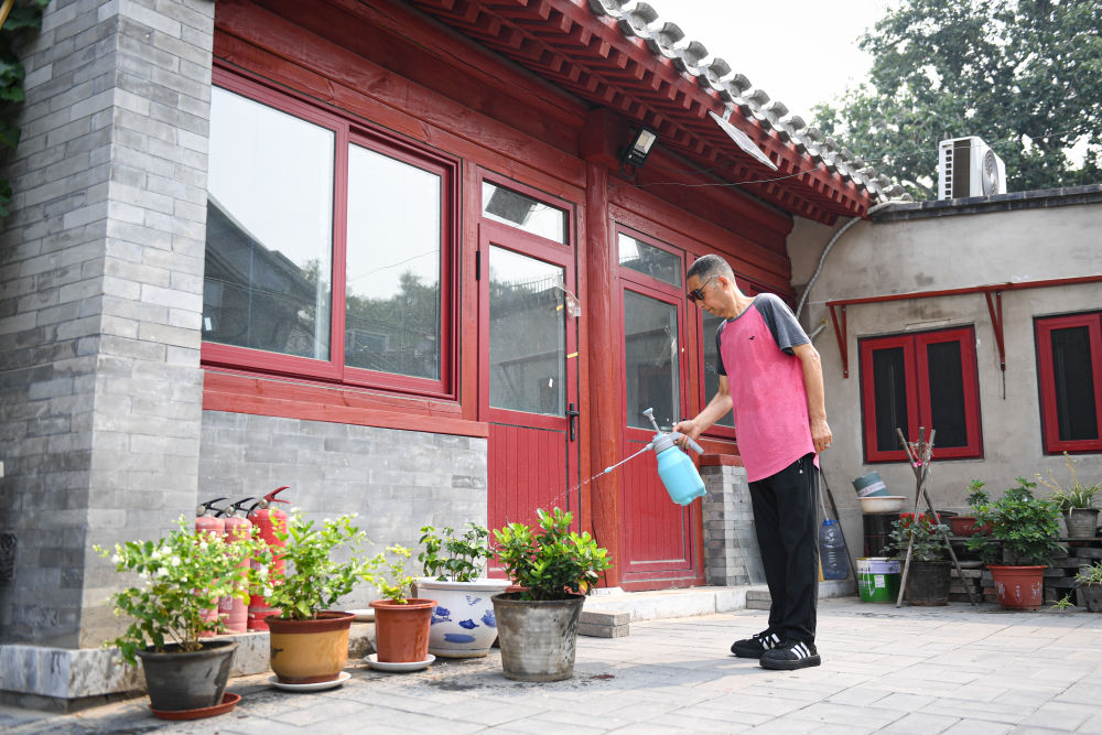范来友在钟楼湾胡同里的自家院子浇花(7月10日摄)。