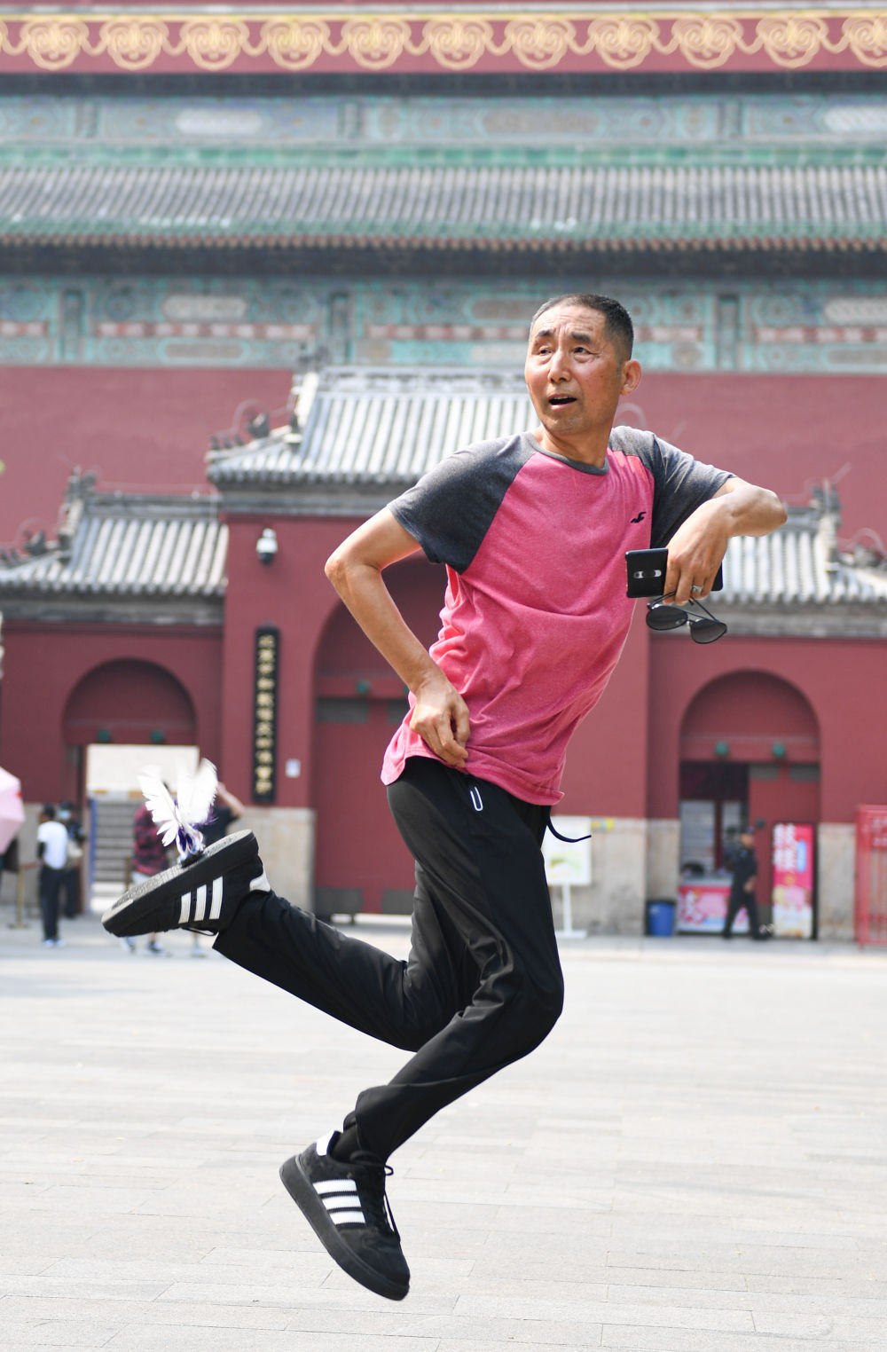 范来友在钟鼓楼广场上踢毽子(7月10日摄)。