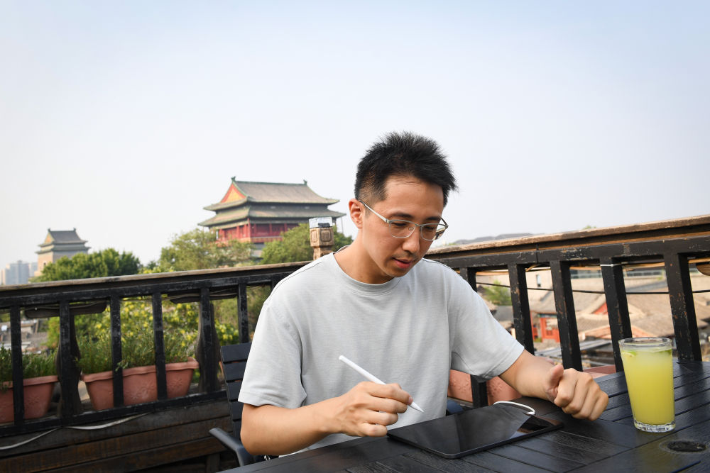 宋壮壮在什刹海地区的露台咖啡厅画图(7月10日摄)。