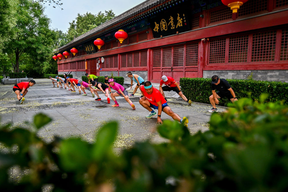 跑者们在位于地安门的中国书店前热身(7月20日摄)。