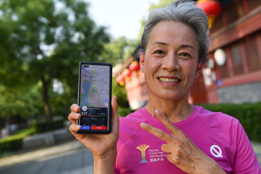 跑者刘计香向记者展示在北京中轴线上的跑步轨迹(7月20日摄)。
