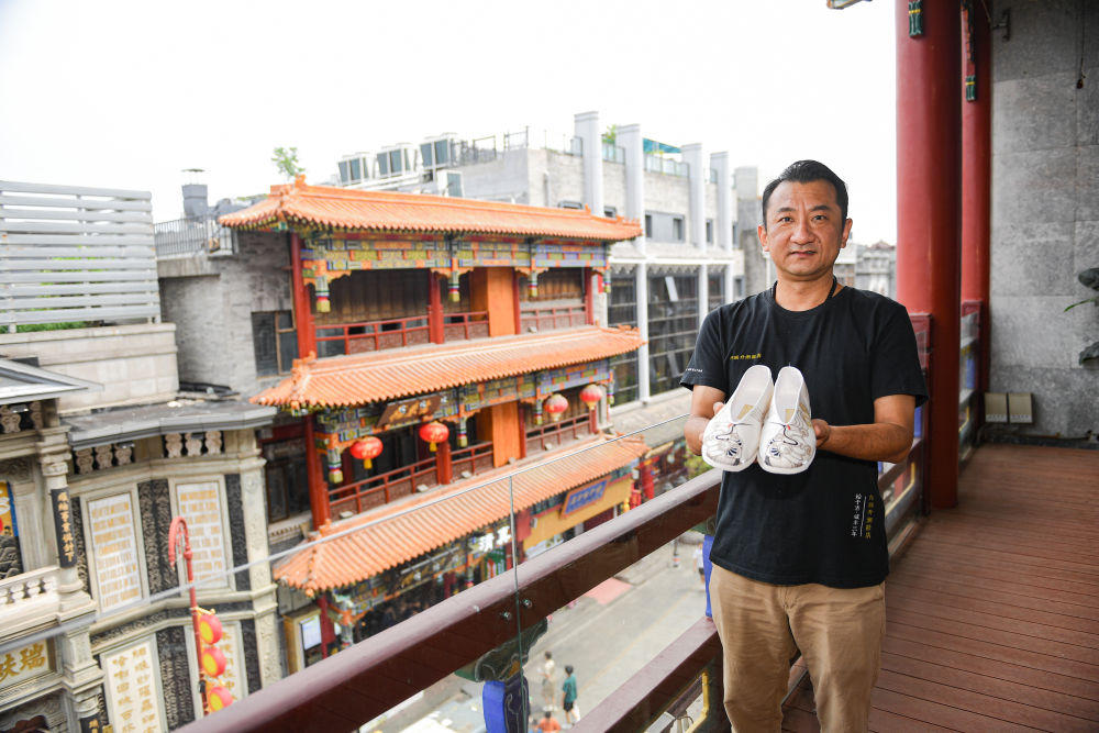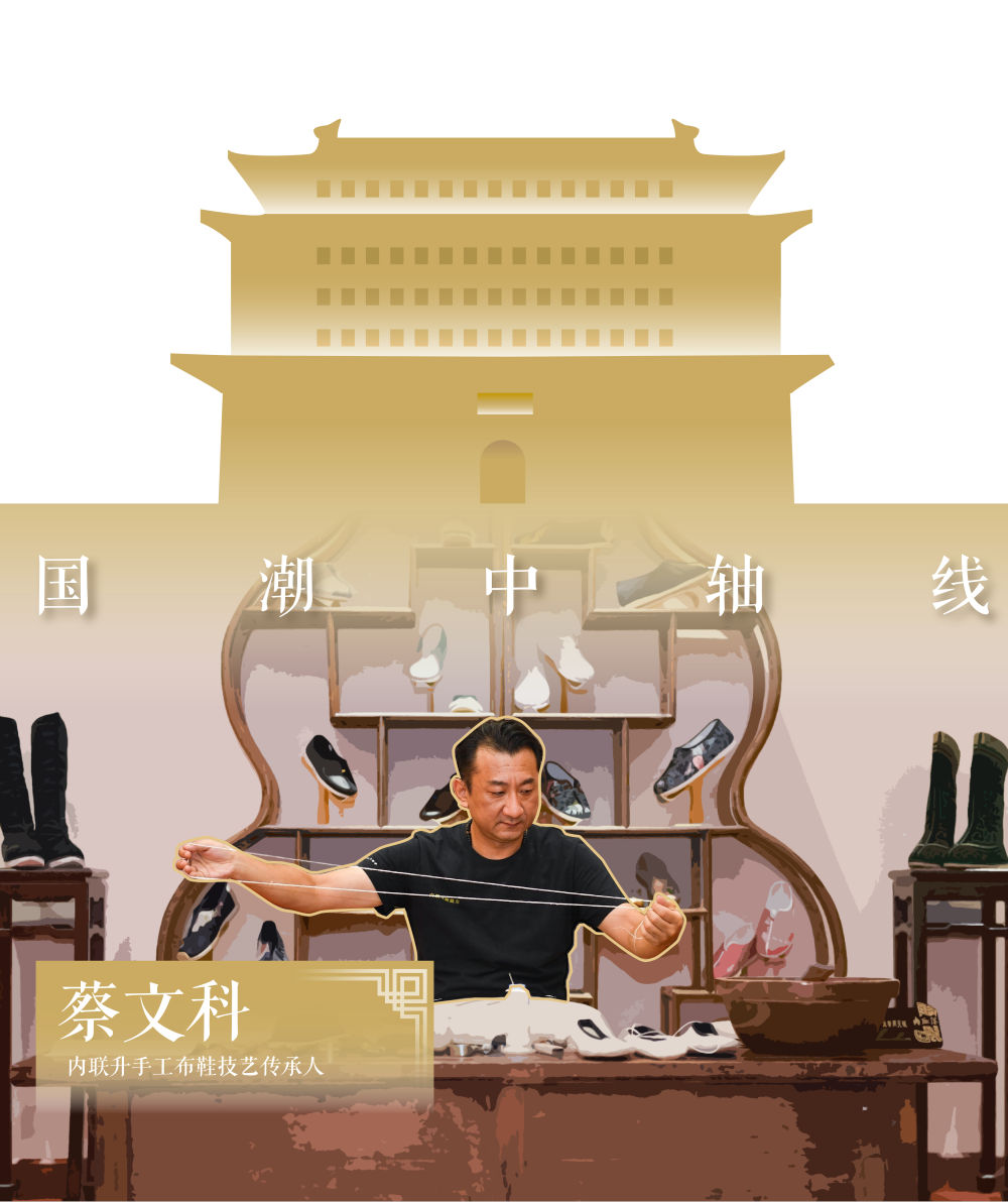作为百年老店内联升手工布鞋技艺的传承人,蔡文科一边承袭前辈经验,一边研发创新,探索做出一双双融合传统文化与时代特点的手工布鞋。他希望,越来越多人可以穿上国潮布鞋,行走在北京中轴线上,感受多彩的中华文化。