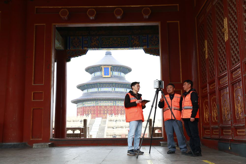 北京市测绘设计研究院团队在天坛进行测绘(2023年4月3日摄)。