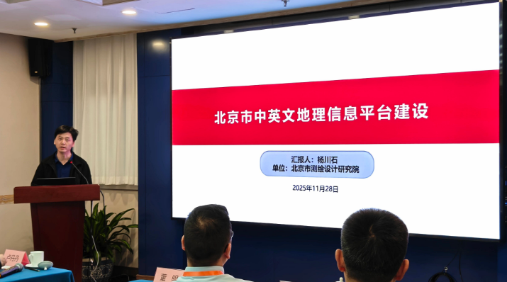 北京市测绘设计研究院信息三部副部长、正高级工程师杨川石做了《北京市中英文地理信息平台建设》的报告。报告系统分享了平台建设的核心创新与实践成果,首创地图注记英文译写规则,攻克多源数据融合与自动制图技术难题,构建起 “数据 — 地图 — 服务” 一体化服务架构。该平台日均瓦片调用量达 1.2 亿次,在智慧城市建设、政务信息公开、涉外服务保障等多维场景中发挥重要支撑作用,为特大城市提升地理信息国际表达与开放服务能力提供了 “北京经验”。